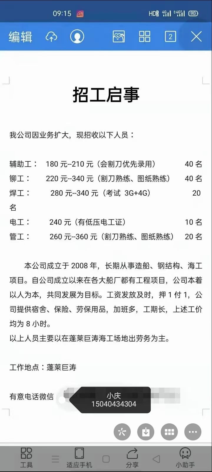 蓬莱常年招聘,,会用打磨机,割刀会割直线就行,260一天,活不累,特别合适,一个月40个工,1万元左右,年后一起走,非诚勿扰15040434304